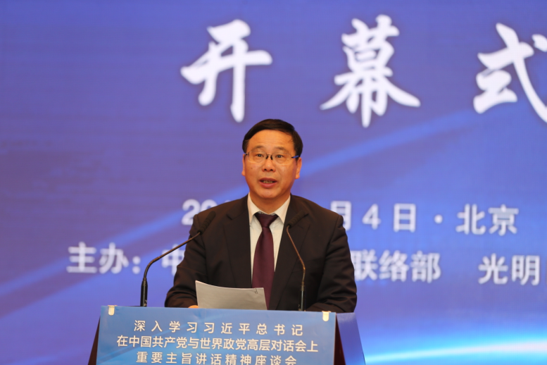 中央党史研究室副主任冯俊在开幕式上发表题为“人类命运共同体倡议是全球治理的中国方案”的主旨讲话。他从人类命运共同体的倡议为世界贡献了协和万邦的和平发展观、为世界贡献了和而不同的文明观、为世界贡献了同舟共济的安全观三个方面阐述了观点。(光明日报记者郭俊锋/摄)