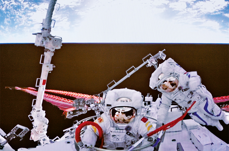 2022年9月2日零时33分,经过约6小时的出舱活动,神舟十四号航天员陈冬、刘洋、蔡旭哲密切协同,完成出舱活动期间全部既定任务,陈冬、刘洋已安全返回问天实验舱,出舱活动取得圆满成功。图为9月2日在北京航天飞行控制中心拍摄的神舟十四号航天员结束出舱任务正在返回的画面。新华社发 李杰/摄