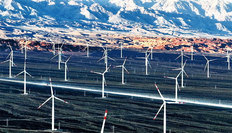 2022年5月21日,新疆生产建设兵团六师北塔山牧场刚刚建成的风力发电场风机林立,一派壮观的场面。 人民图片王志清/摄