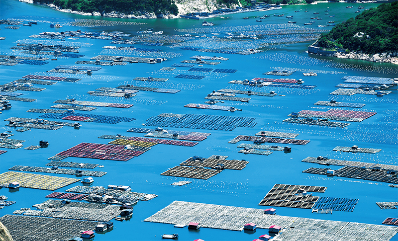2022年8月15日,福建省连江县奇达村连成片的渔排宛如一座“海上牧场”(无人机照片)。奇达村是一个集齐了“山、海、岛、渔村”等元素的千年古村落,是天然的避风良港,适合养殖鲍鱼、海带等海产品。中新社记者 王东明/摄