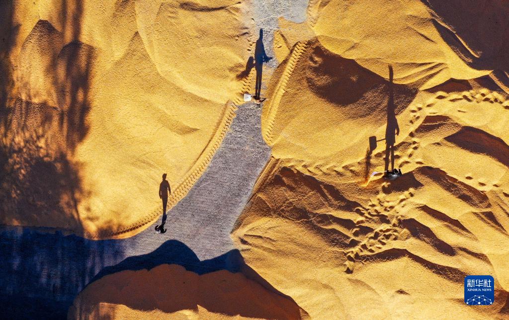 10月18日,在通辽市奈曼旗新镇舍布日图嘎查,工人在收粮站晾晒玉米(无人机照片)。