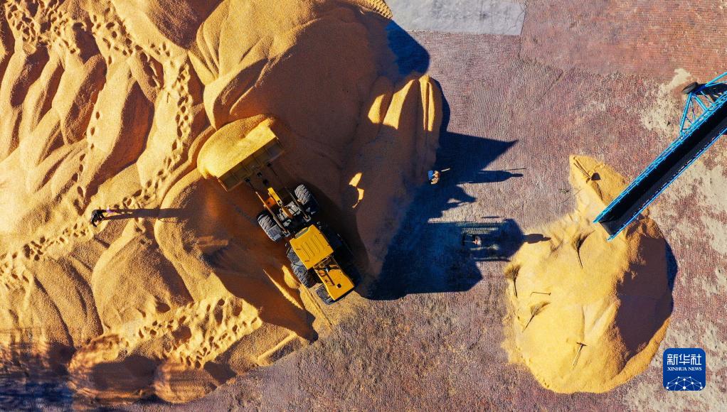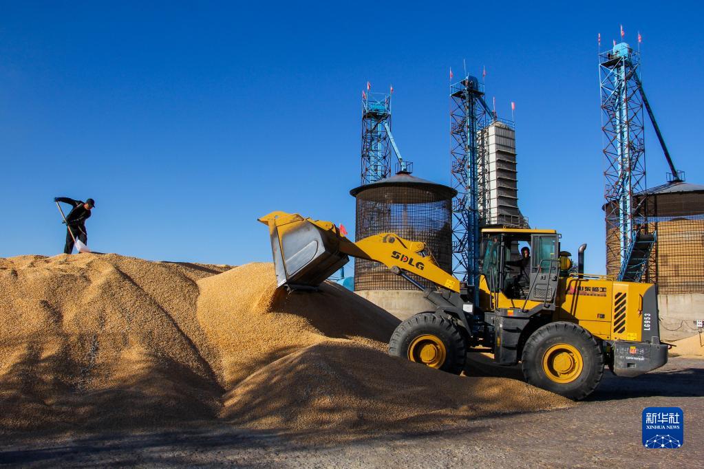 10月18日,在通辽市奈曼旗新镇舍布日图嘎查,工人在收粮站晾晒玉米。
