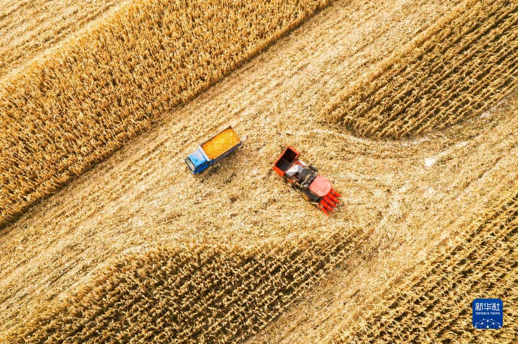 10月18日,在通辽市奈曼旗新镇大代村,农机手操作收割机在田间收获玉米(无人机照片)。