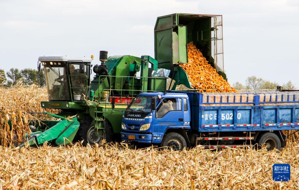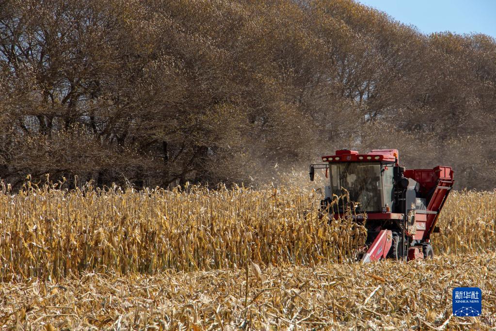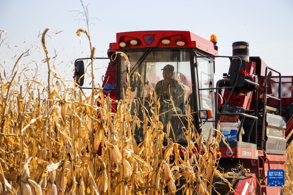 10月18日,在通辽市奈曼旗新镇大代村,农机手操作收割机在田间收获玉米。