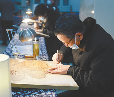 江苏扬州广陵古籍刻印社雕版印刷技艺展示馆,传承人正在刻版。