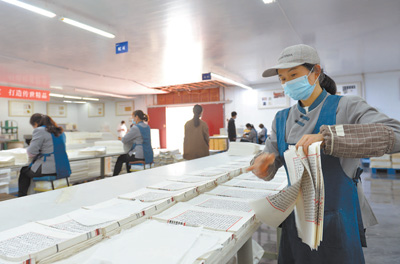 安徽省泾县三希堂线装文化园,工人们正在重印台北故宫博物院藏文渊阁本《四库全书》。