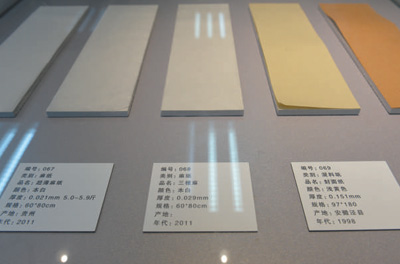 南京图书馆展示的用于古籍修复的不同年份和材质的纸张。