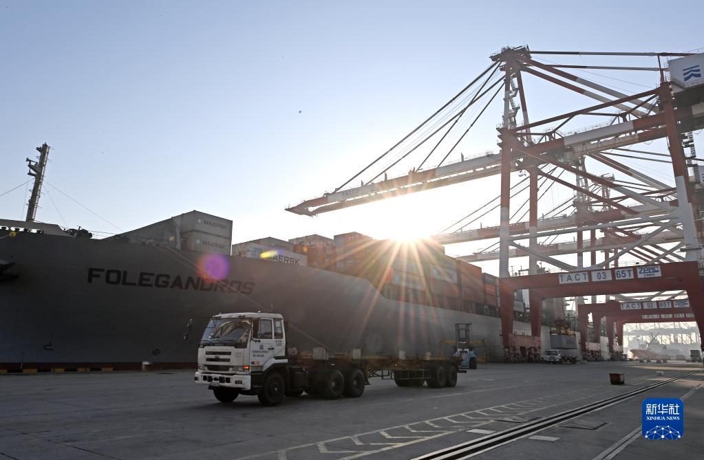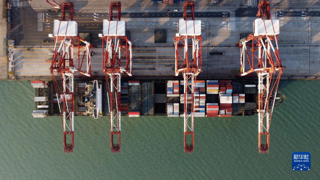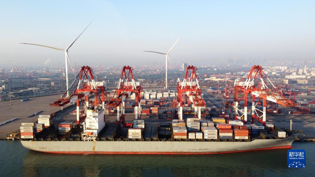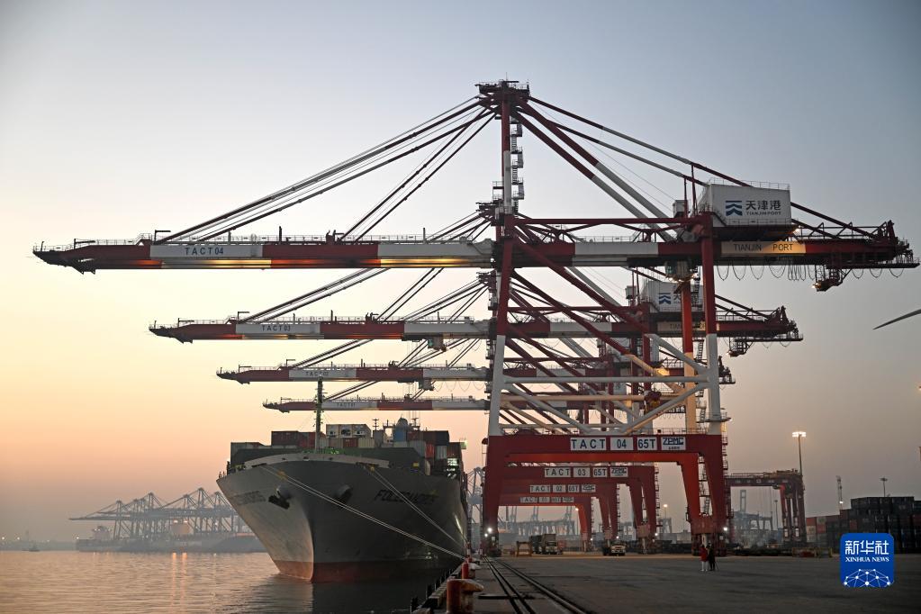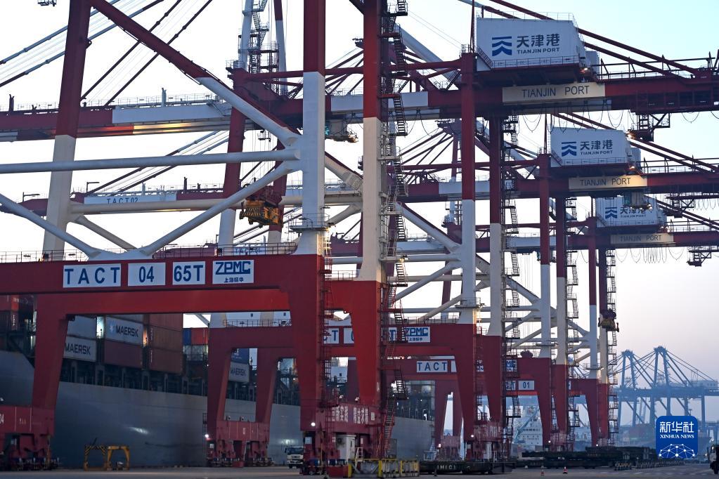 1月1日,一艘货轮靠泊在天津港联盟国际集装箱码头进行装卸作业。
