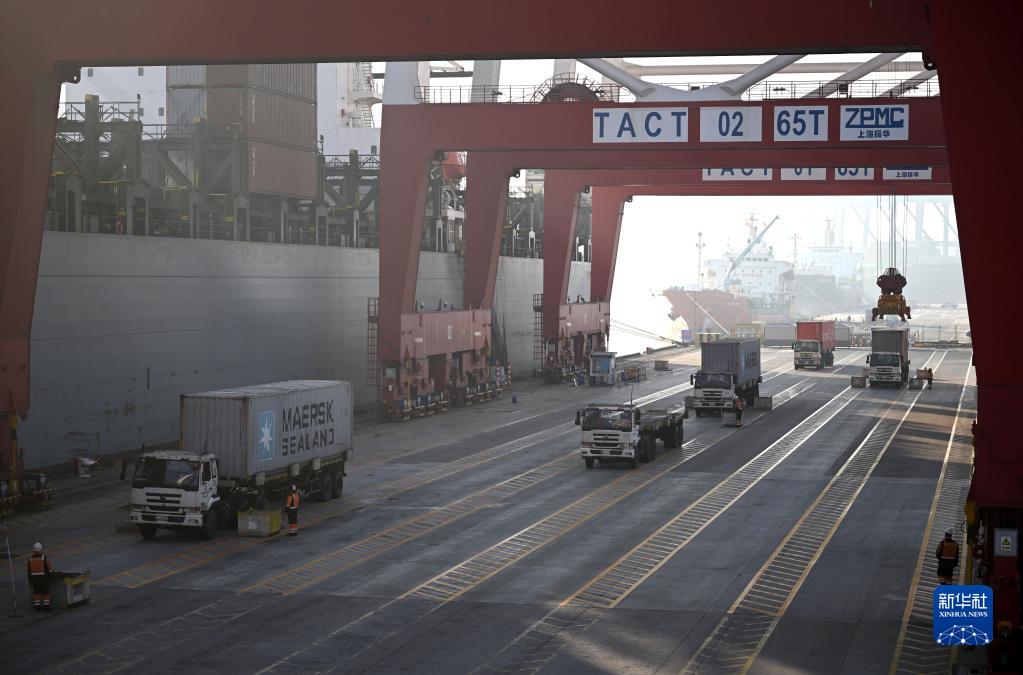 1月1日,卡车在天津港联盟国际集装箱码头运输集装箱。