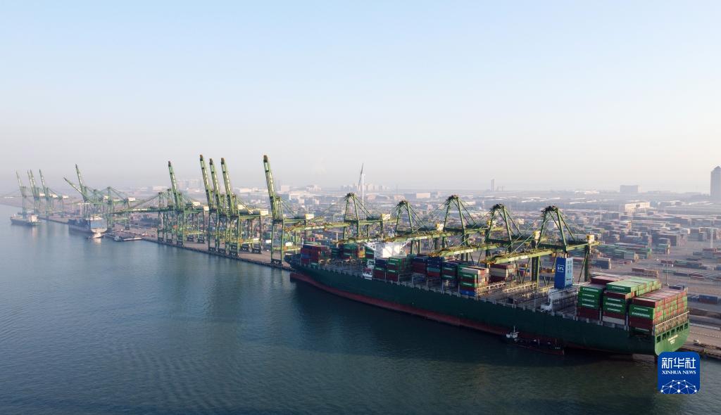 1月1日,货轮靠泊在天津港太平洋国际集装箱码头进行装卸作业(无人机照片)。