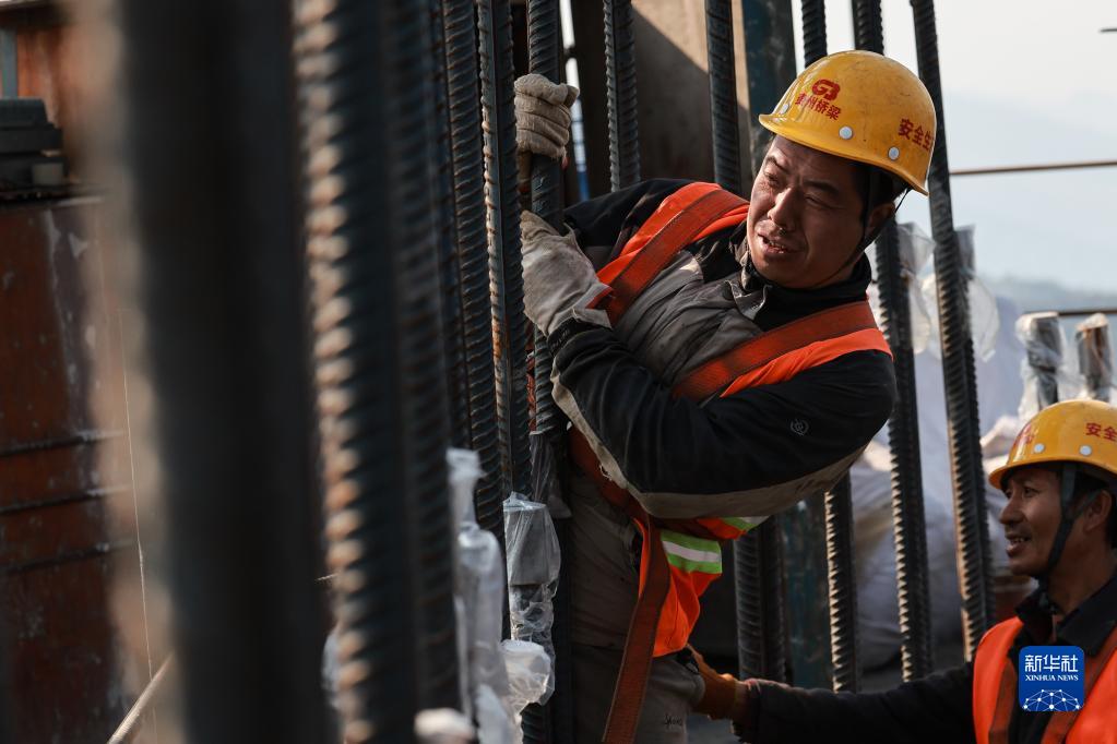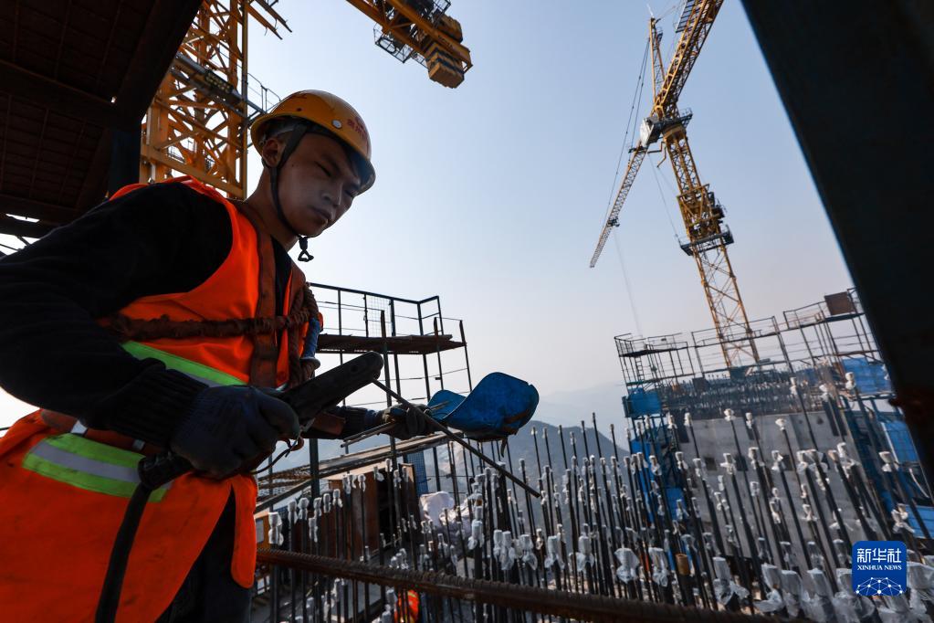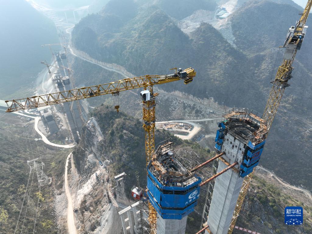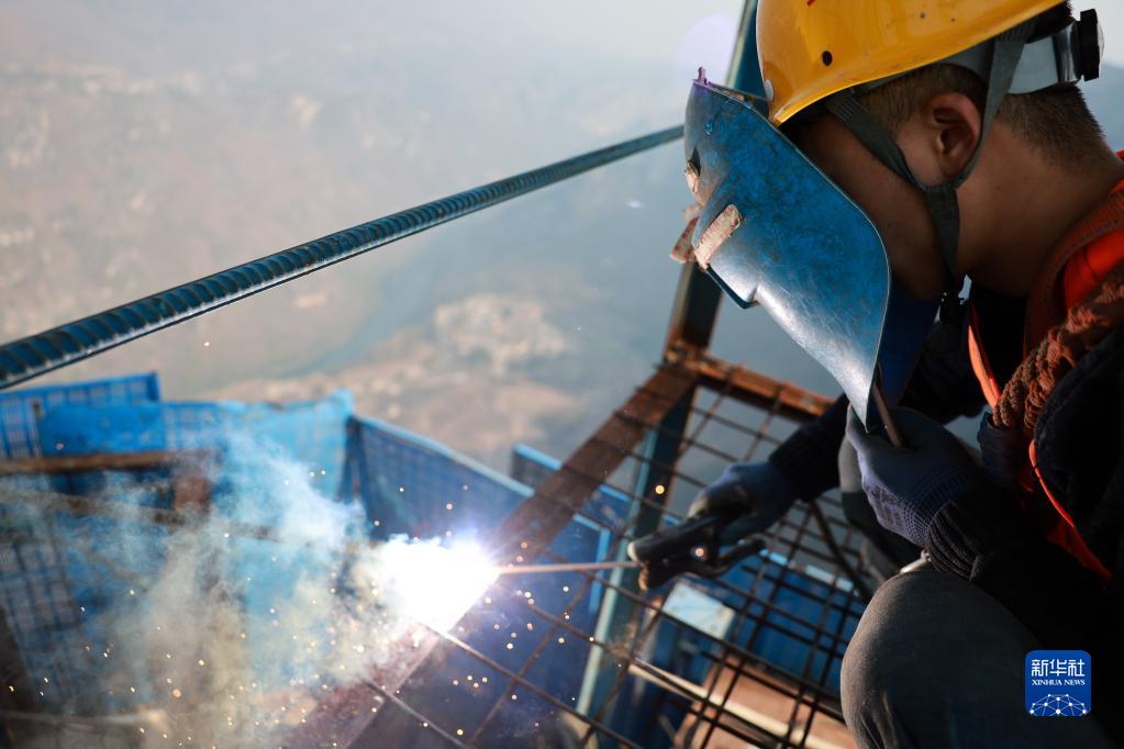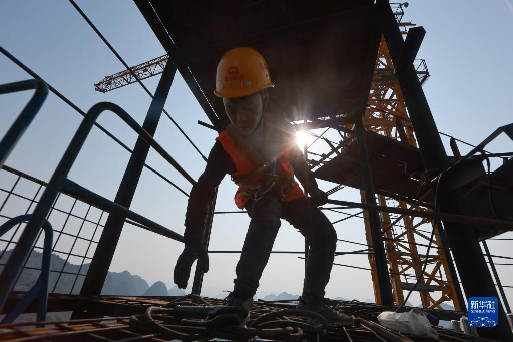 2月1日,施工人员在花江峡谷大桥主塔上施工。