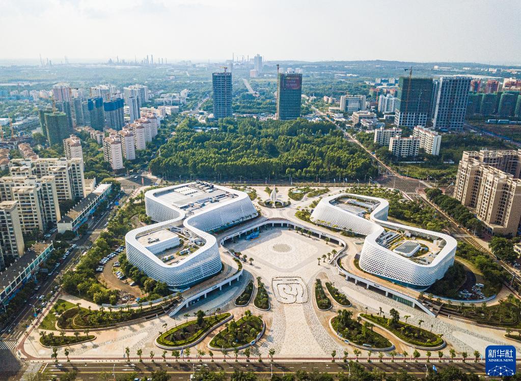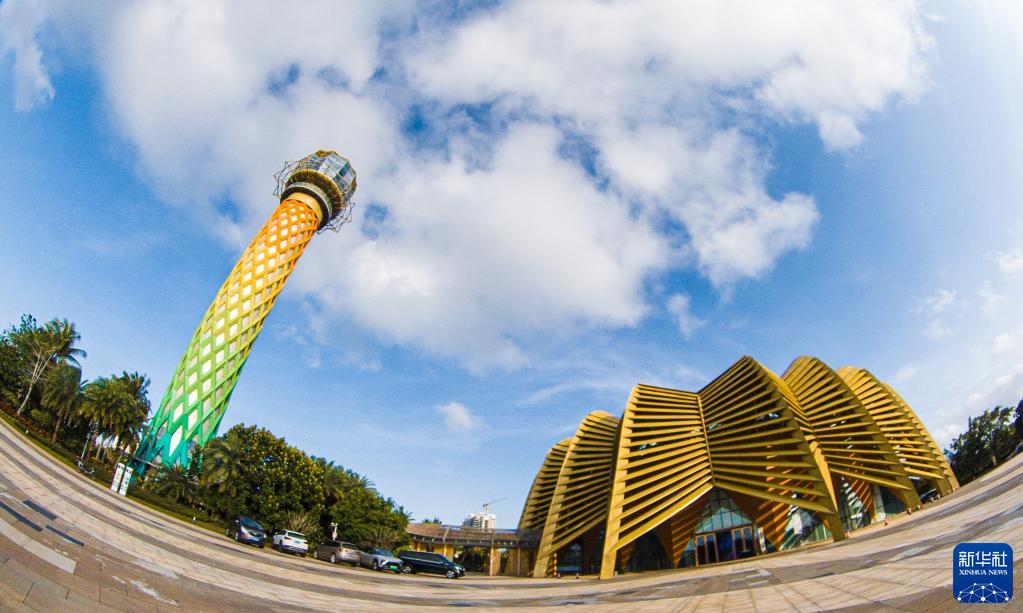 2月8日拍摄的海南自贸港重点园区——海口江东新区标志性建筑江东塔和江东新区展示中心(全景相机拍摄)。