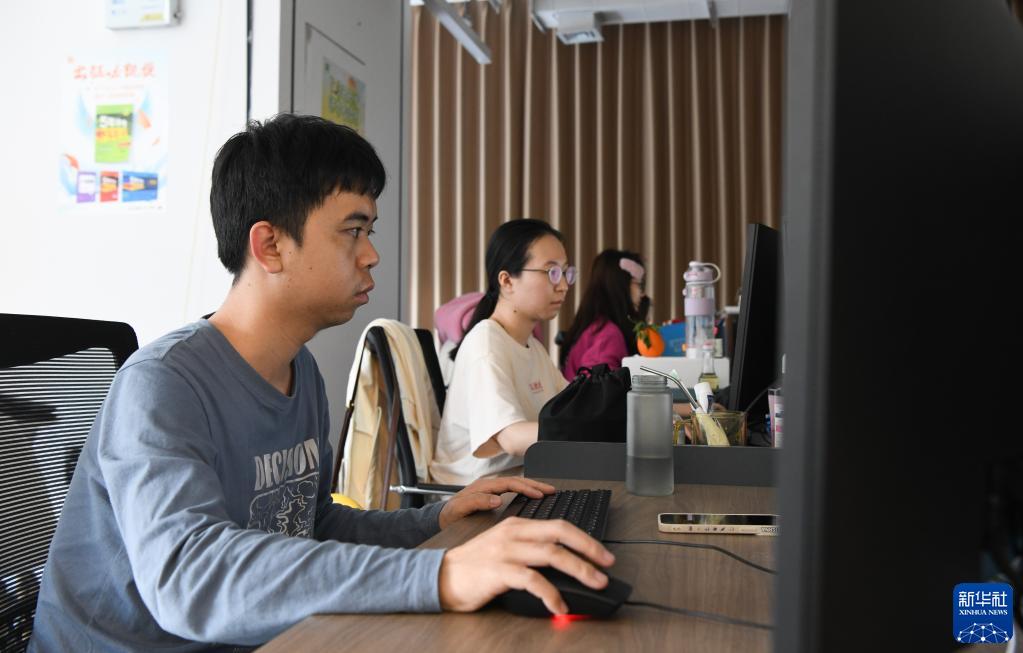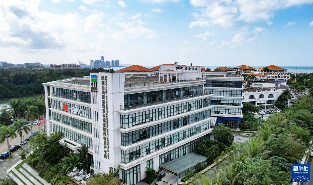在海南自由贸易港海口复兴城互联网信息产业园一区内,企业员工在国际离岸创新大厦内办公(2月8日摄)。