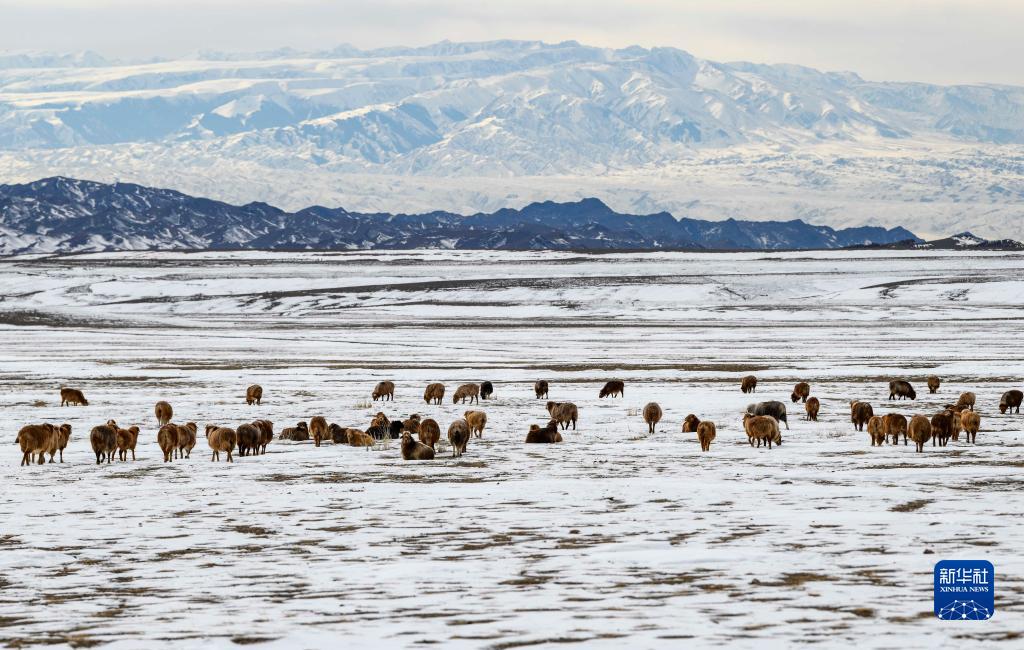 羊群在新疆裕民县巴尔鲁克山南坡的冬牧场上觅食(2月9日摄)。