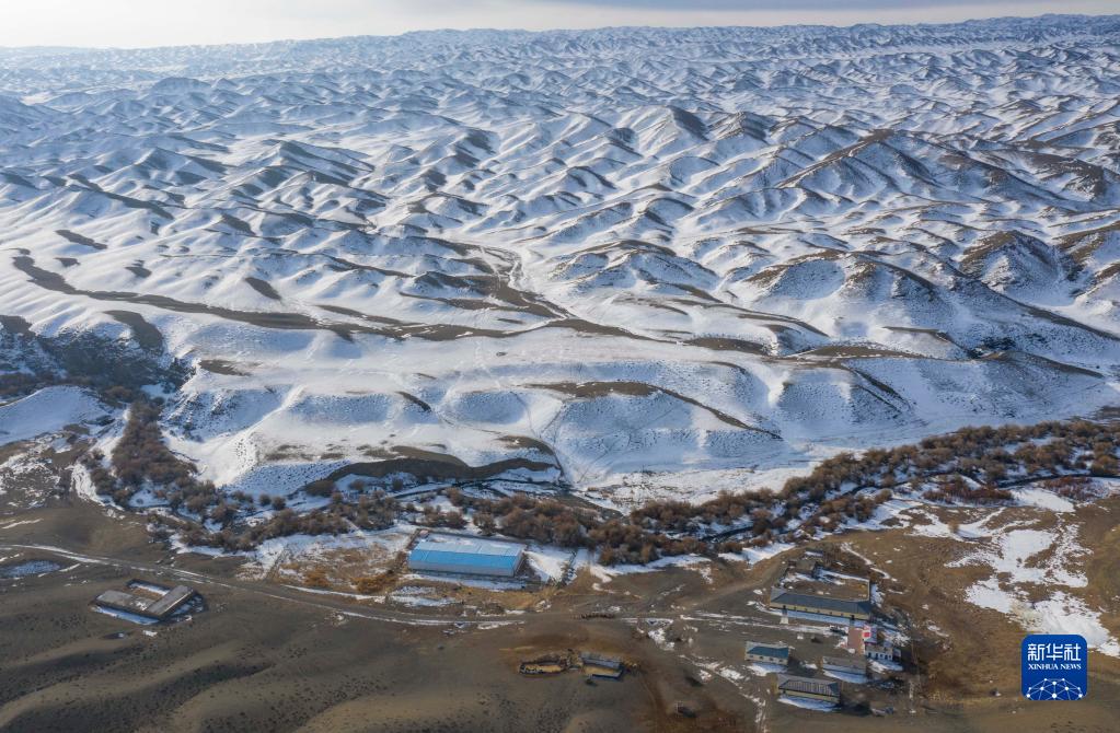 位于新疆巴尔鲁克山南坡的裕民县巴尔鲁克牧业幸福驿站、应急饲草料储备库、牧业医院(2月12日摄,无人机照片)。