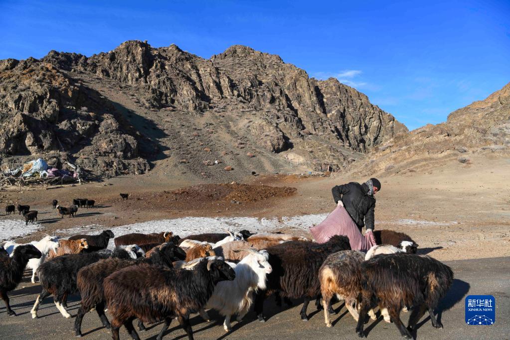 新疆裕民县巴尔鲁克山区,牧民给羊群喂食(2月10日摄)。