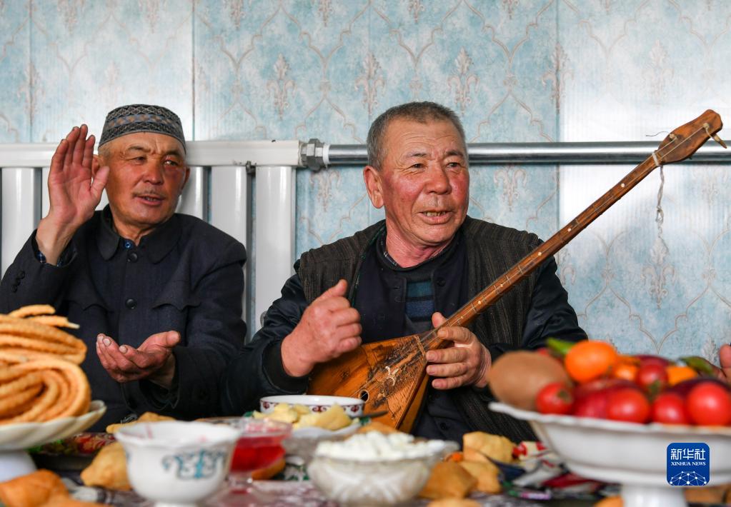 在一次邻里聚会上,巴尔鲁克山区牧民木拉提(右)即兴弹唱歌曲,身边的朋友沉醉其中,打着节拍(2月12日摄)。