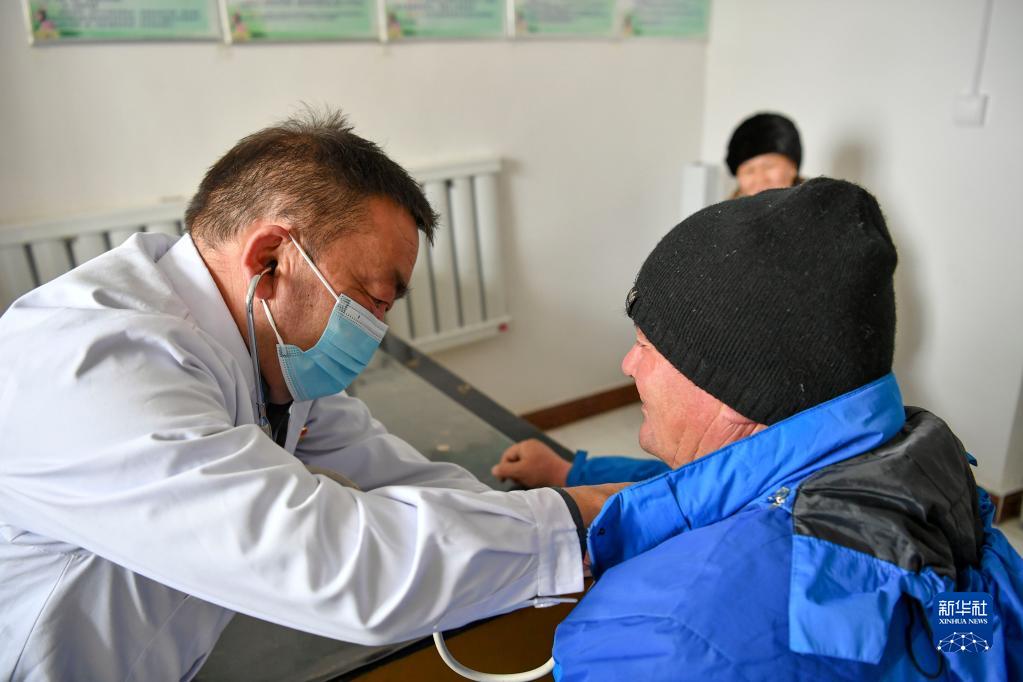 新疆裕民县牧业医院医生叶尔江·库坎(左)为牧民检查身体(2月12日摄)。为方便牧民,牧业医院会定期开展上门巡回诊疗,送健康上门。