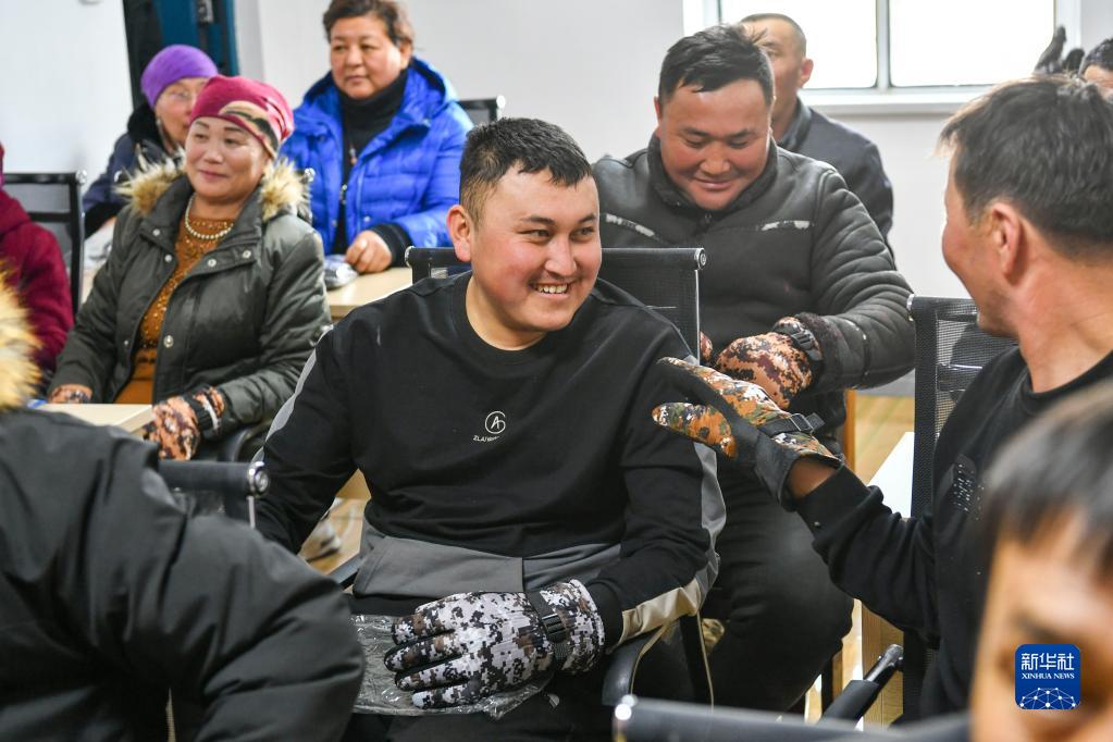 在新疆裕民县巴尔鲁克牧业幸福驿站的小教室,牧民阿依巴尔·阿斯哈尔(中)参与知识问答后,获得一副手套作为奖品(2月9日摄)。