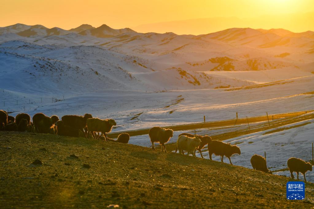 新疆裕民县巴尔鲁克山区,夕阳映照牧场,羊群归来(2月11日摄)。
