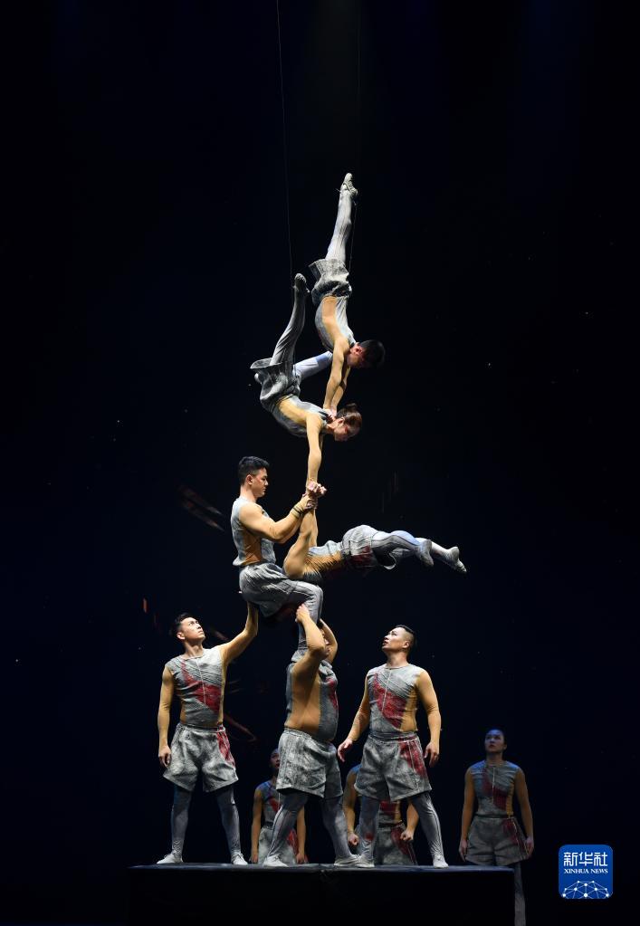 3月27日晚,在位于山东省济南市的山东剧院,演员表演杂技节目《无形·倒立技巧》。