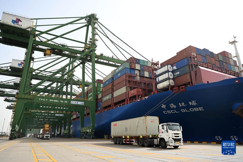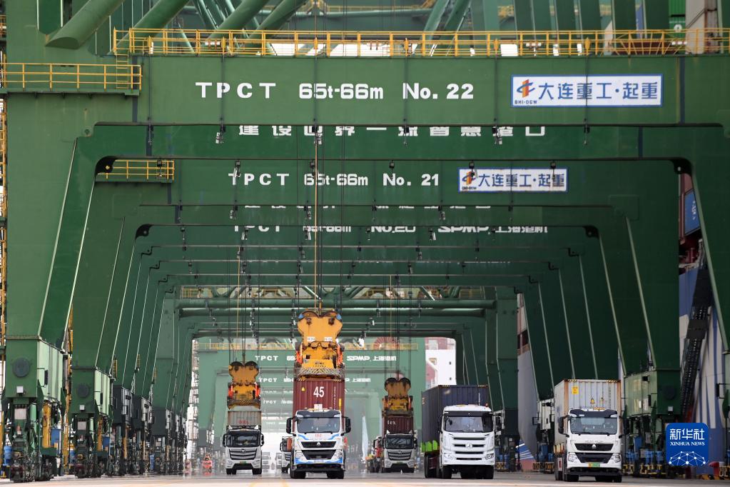 4月11日,卡车在天津港太平洋国际集装箱码头运输集装箱。