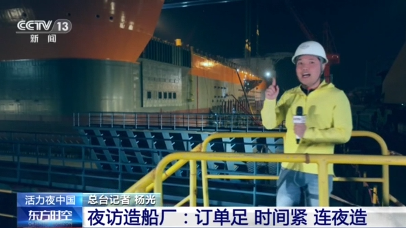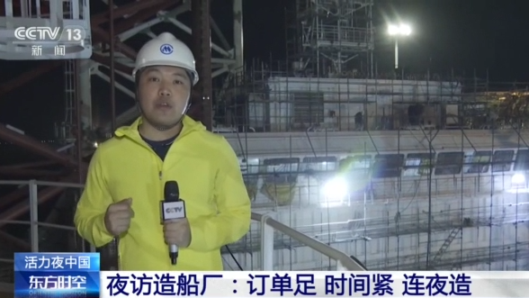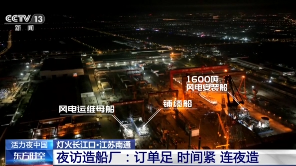 总台记者杨光:我所在的企业码头周边总共有24艘船正在建造,我现在所在的是一艘风电安装和运输船。这会夜班的工人大概有200多人正在加班加点作业,主要从事的是一些船舶室内装修和最后的功能调试阶段。这个船是在6月中旬就要交付了,应该来说工期还是非常紧的。
