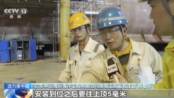 启东中远海运海洋工程有限公司搭载工区工程主管陈敏乐:上口和我们这个下口安装到位之后要往上顶5毫米,这块进度要领跟工人做好交流。