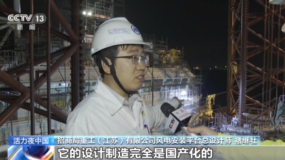 招商局重工(江苏)有限公司风电安装平台总设计师褚继壮:你可以看一下我们这个升降系统,这个升降系统是这条船最核心的设备,它的设计制造完全是国产化的。另外一个是齿条板,在2020年之前都是被国外垄断的,目前这条船已经达到了98%的国产率。