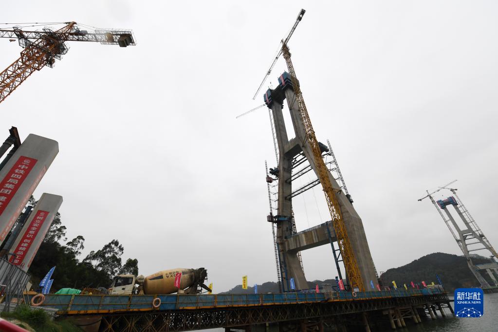 这是已经实现主塔封顶的广西上横高速公路西津郁江特大桥(4月24日摄,无人机照片)。