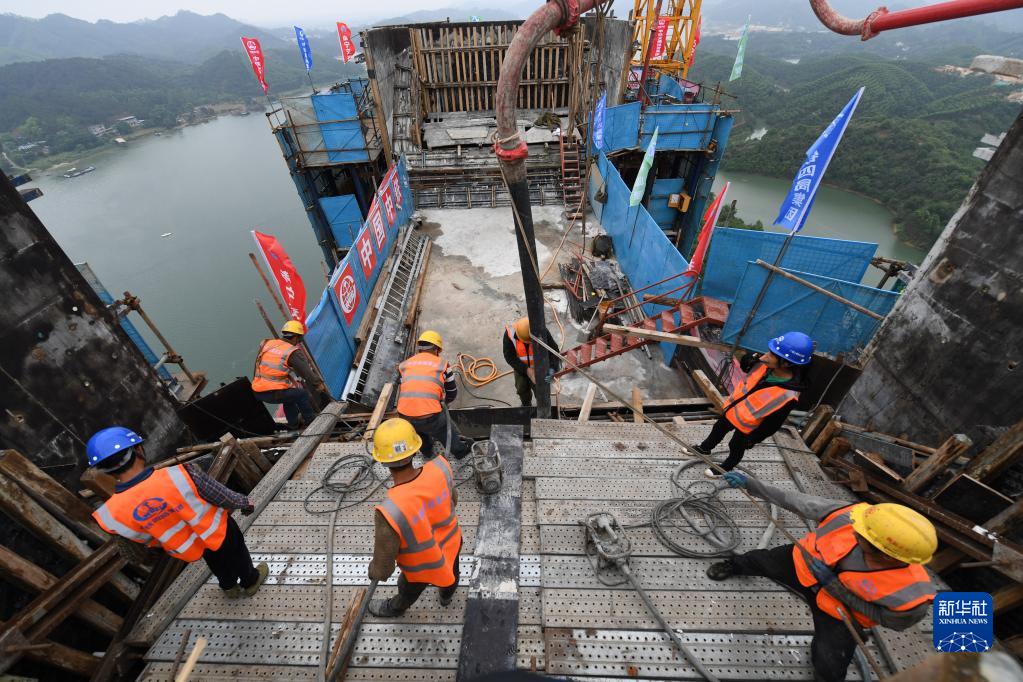 4月24日,在广西上横高速公路西津郁江特大桥建设现场,中铁四局集团工人在进行主塔封顶施工。