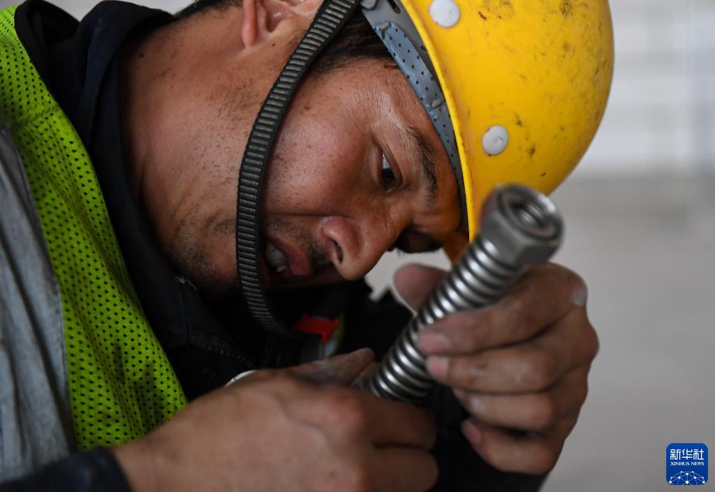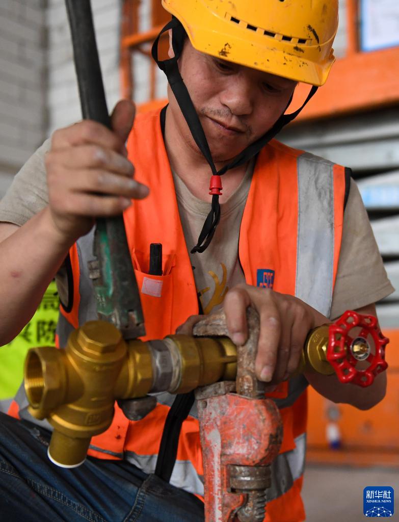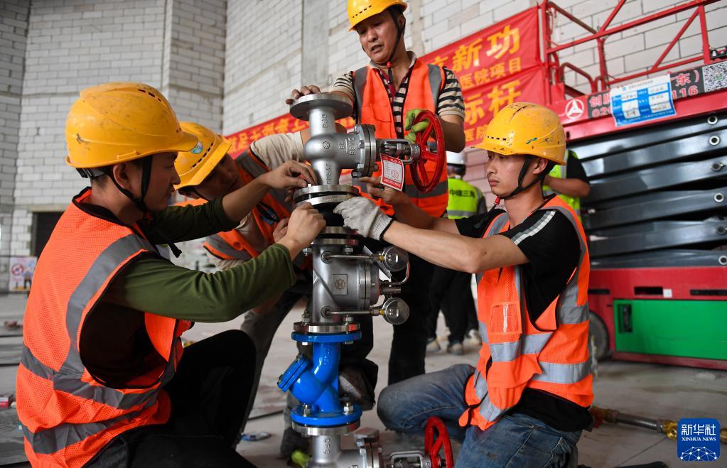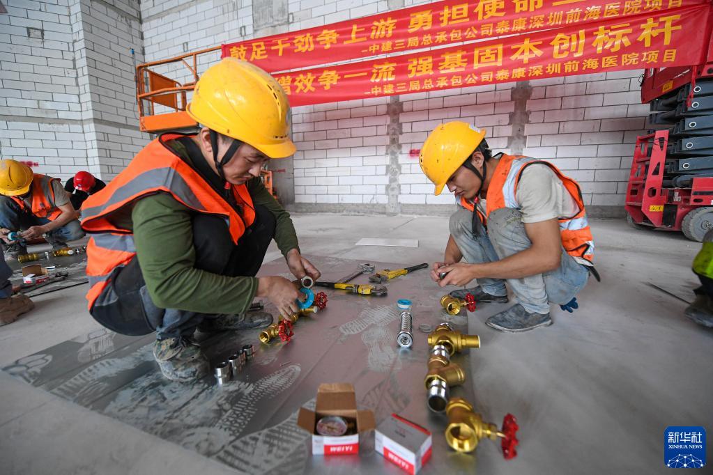 4月25日,在深圳前海泰康国际医院项目工地,建筑工人参加阀门组装工艺技能比拼。