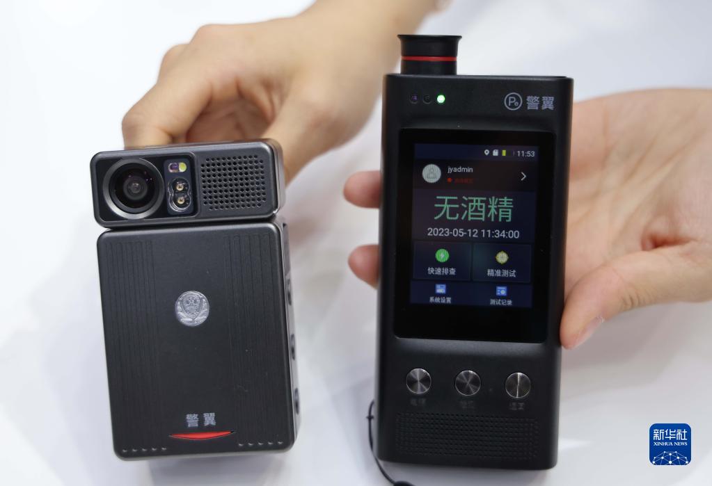 5月12日,工作人员在展示5G警翼执法记录仪(左)和酒检仪。