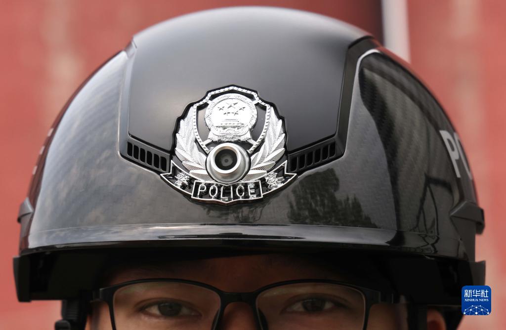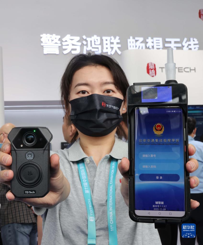 5月12日,工作人员在展示交警多功能移动警务终端(右)和5G执法记录仪。