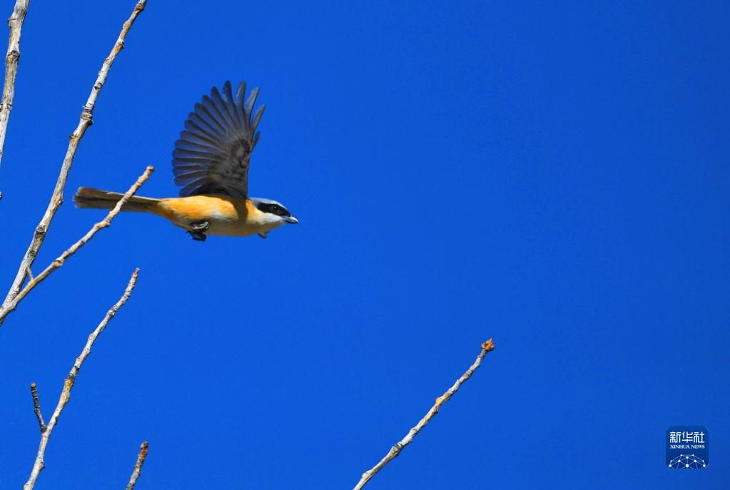 灰背伯劳在拉萨市城关区蔡公堂街道次角林村上空飞过(5月14日摄)。