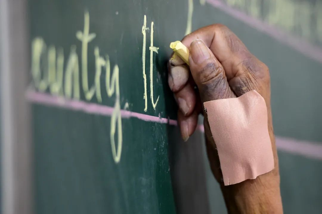 叶连平在“留守未成年人之家”教室里为英语课准备板书。新华社记者张端 摄