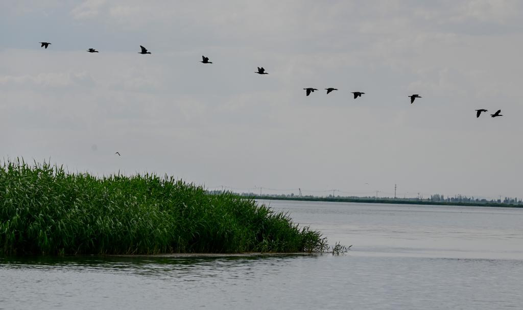 6月5日,一排候鸟在乌梁素海上空飞翔。新华社记者 连振摄