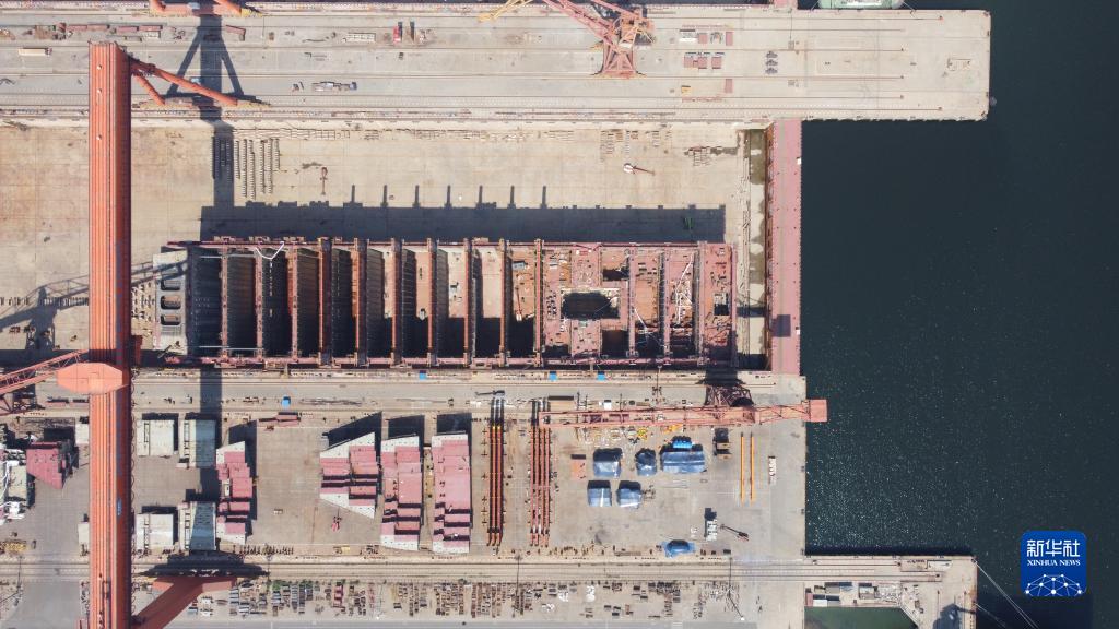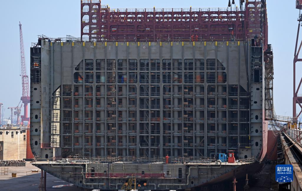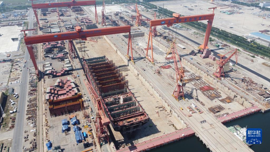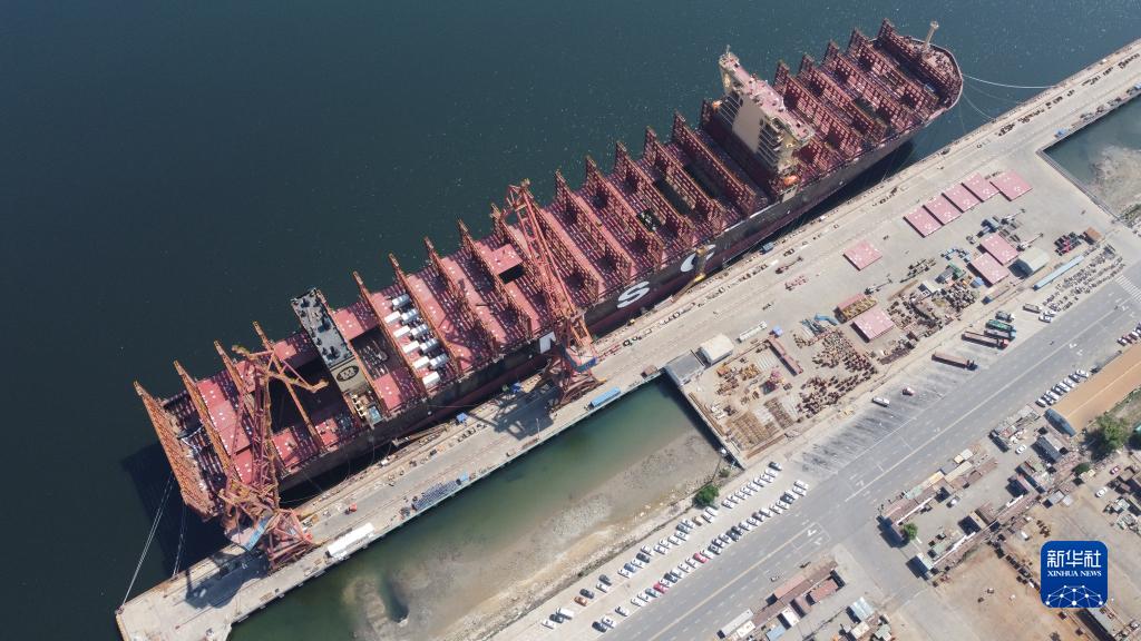 6月21日,在中船(天津)船舶制造有限公司厂区,船坞内正在建造一艘大型集装箱船。