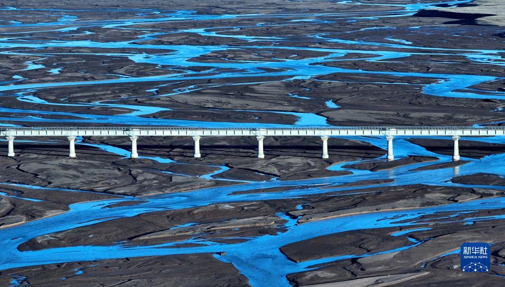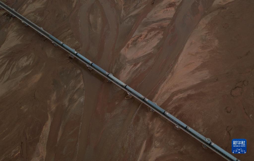 6月15日,一列火车驶过长江源地区的沱沱河。新华社记者张铖摄
