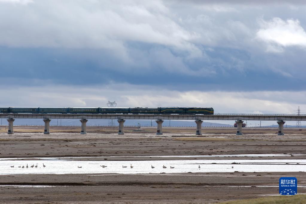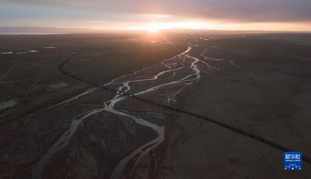 6月16日,一列火车经过长江源地区的楚玛尔河。新华社记者金立旺摄