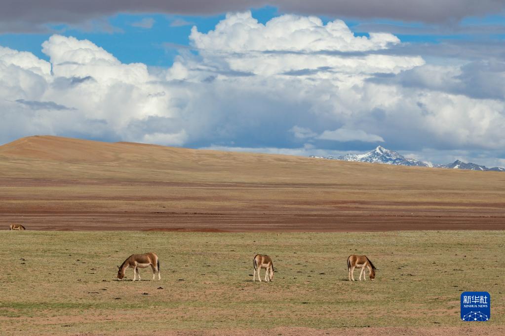 6月15日,在长江源地区的楚玛尔河附近,几只藏野驴在觅食。新华社记者金立旺摄