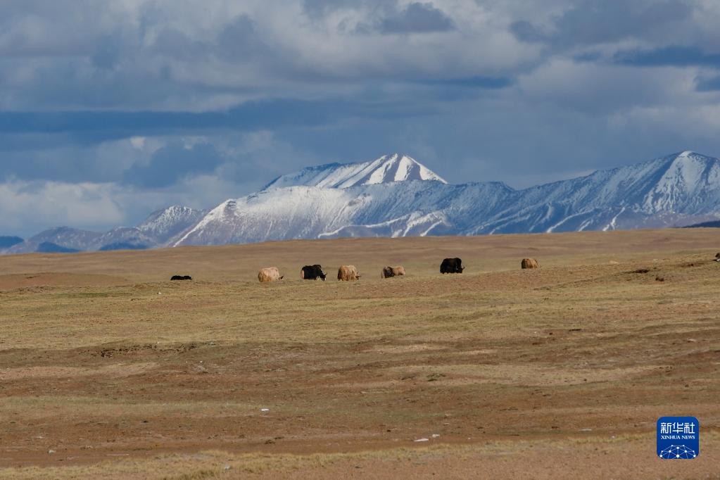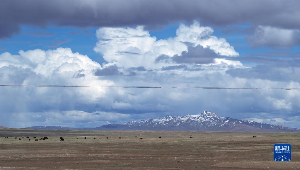 6月14日,在长江源地区的沱沱河附近,一群牦牛在觅食。新华社记者张铖摄