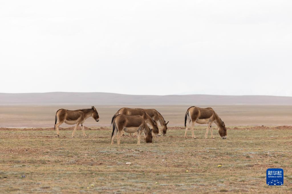 6月14日,在长江源地区的沱沱河附近,几只藏野驴在觅食。新华社记者张铖摄