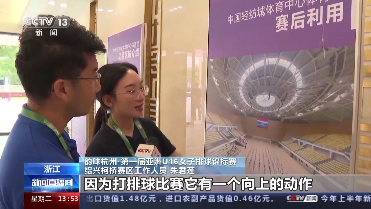 韵味杭州·第一届亚洲U16女子排球锦标赛绍兴柯桥赛区工作人员朱君莲:过去上面是有透光的,因为打排球比赛它有一个向上的动作,包括我们抬头过去它是不能有光的,所以后来改造的时候在上面全都贴上了膜布。