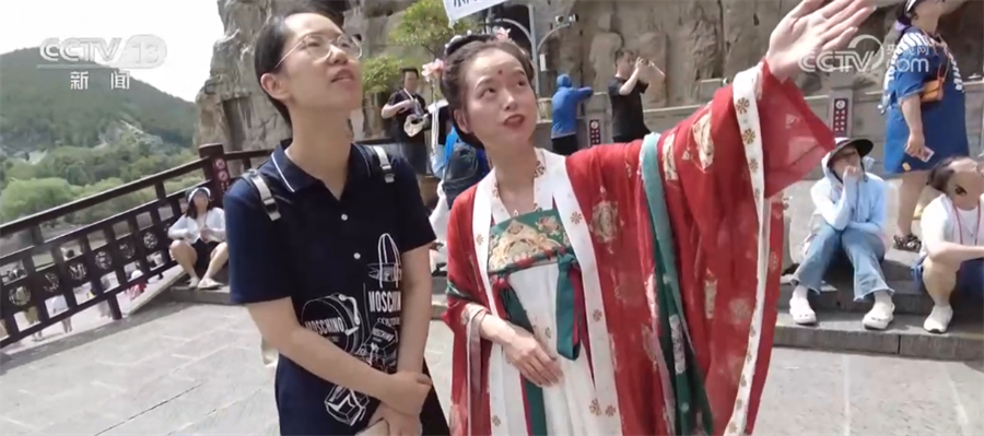 记者徐倩:在龙门石窟,我发现一个很特别的点,往年来这里,都是导游来陪大家一起逛龙门石窟、来讲解。今年的导游做了一个服务升级,会穿着这种比较有特色的唐装。