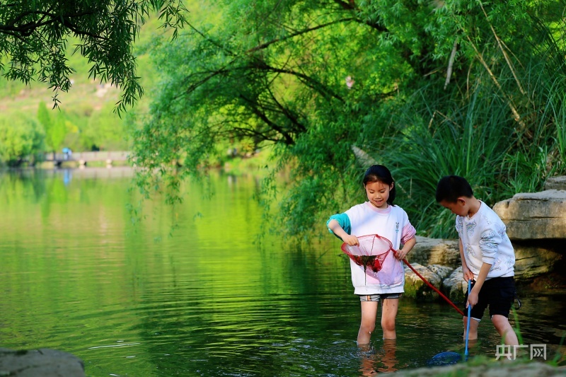 在贵阳市花溪区,孩子们在清澈见底的小溪边玩耍(央广网记者栾小琳 摄)
