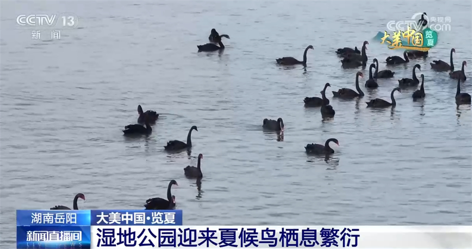 时值盛夏,湖南岳阳湘阴的洋沙湖-东湖国家湿地公园引来大批夏候鸟来此栖息繁衍。碧波荡漾、清荷摇曳,黑天鹅在此嬉戏觅食,麋鹿闲庭信步、悠然自得。