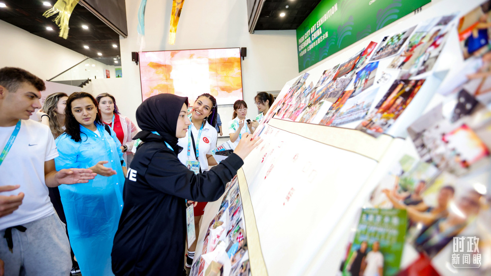 △各国青年运动员正在参观成都大运村内的“雪山下的公园城市,烟火里的幸福成都”主题艺术展。(总台央视记者魏帮军拍摄)