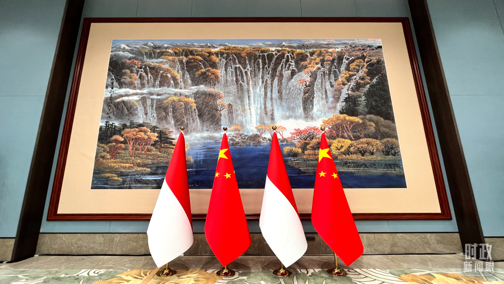 △会见现场的中印尼两国国旗。(总台央视记者张垚拍摄)