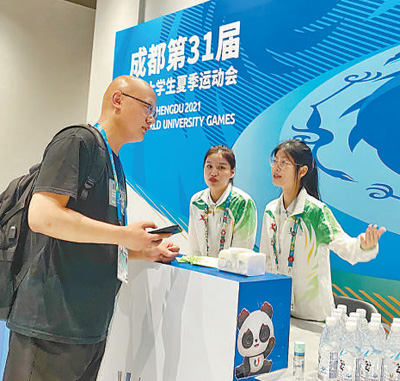 志愿者为媒体工作者提供帮助。本报记者 蒋雨师摄